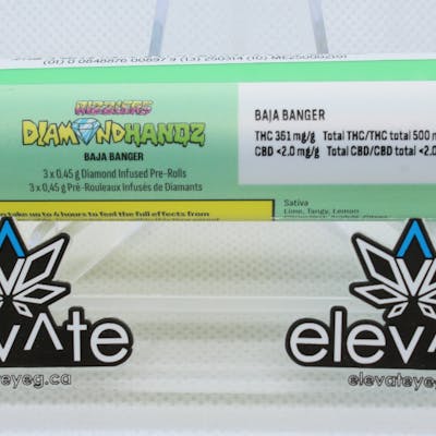 Up your smoke game with the Baja Banger Diamond Handz 0.45 g double-infused pre-rolls. Flexing liquid diamond and distillate infusion for an insane 50% THC without the boujee price tag, soak up the sticky spray of zesty lime and tangy lemon with this certified banger.