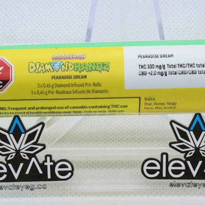 Up your smoke game with the Pearadise Dreams Diamond Handz 0.45 g double-infused pre-rolls. Flexing liquid diamond and distillate infusion for an insane 50% THC without the boujee price tag, sink into this pear and honey oasis, grounded with a touch of tang.
