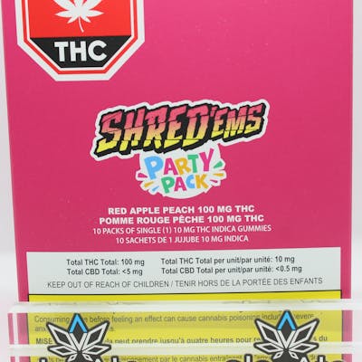 This multipack contains 10 immediate containers, each with one soft chew-for a total of 10 soft chews. SHRED'ems Red Apple Peach Party Pack has 10 packs of MAX10 gummies, each with 10mg THC for a total 100MG THC PER PACK! These juicy indica gummies blend the crisp sweetness of red apple with the smooth, mellow flavour of ripe juicy peach.