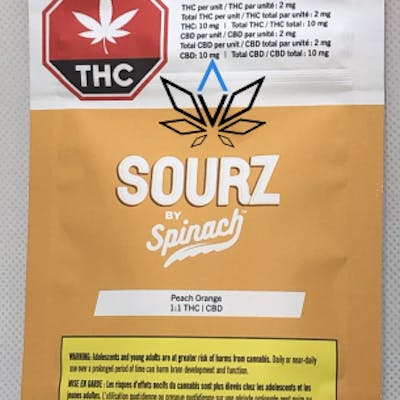 Smash a juicy peach into a succulent orange, then blast it with sour crystals. That's right. We're talking about a dual flavoured explosion called Peach Orange SOURZ by Spinach. These balanced 1:1 THC and CBD soft chews blasted with sour crystals are over the top with natural flavours and colours. With five big S chews per pack, you and your friends can enjoy more SOURZ by Spinach in one sitting with 10mg THC total and 10mg CBD total per pack.
