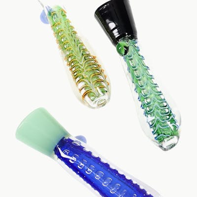 The clear borosilicate stem shows off every whirl of smoke, while a textured “bubble net” core and colored marble accent
