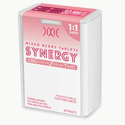 SYNERGY Mixed Berry tablets are the best of both worlds thanks to equal parts CBD and THC. These easy-to-dose tablets produce a well-rounded e?ect that’s greater than the sum of the individual cannabinoids. – SYNERGY products are formulated with both THC and CBD in a 1:1 ratio. – Sold in discreet child-resistant secure slide packaging. – 60 tablets per package. Suggested Use: Allow Dixie tablets to dissolve completely under your tongue. Onset: 30-45 Minutes Duration: 1-3 Hours Potential Effects: Alert, Calm, Creative, Euphoria Ingredients: Isomalt, Natural Flavors, Citric Acid, CO2 Cannabis Extract, Silicon Dioxide, Magnesium Stearate