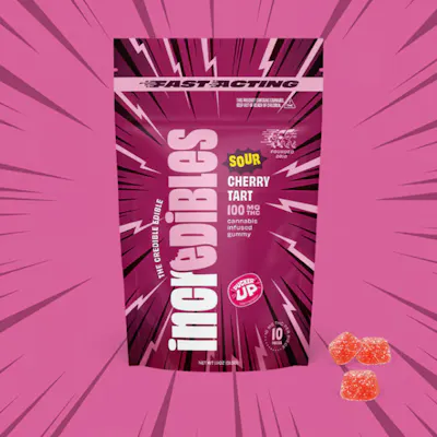 Very tart, never tardy. Sweet sunshine, tart cherries and an electrifying good time. Featuring a 10-Pack of precision-dosed confection collection with yummy flavors and delicious effects,you can trust incredibles to be the credible edible. Potential effects: Promotes general relaxation, promotes emotional well-being Serving size: Standard serving is a single gummy (10mg THC). Bag contains ten gummies for a total of 100mg THC. Onset & duration: Onset may take up to 2 hours. Duration can last up to 3+ hours. Effects vary by individual. Estimates are based on a standard serving. Contents: Made with pure THC oil and evenly blended for consistency. Allergens: Coconut oil. Made in a facility that processes tree nuts, peanuts, milk, soy, and wheat.