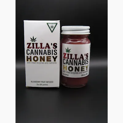 Zilla's Blueberry Infused Cannabis Honey with intact enzymes and nutrients. All Natural. Unfiltered. Biologically Active. Raw. Unpasteurized. Wild. Directions for use: THC tolerance may vary from person to person. The accepted recommendation for a new user is 10mg THC. Experienced users can figure their preferred serving size by referring to the dosage information. Serving size: 0.5g TSP / 8MG THC Total servings: 25 TSP INGREDIENTS: Raw Unpasteurized Honey, Whole Fruit, Natural Flavor, THC Cannabis Extract. Do not refrigerate. Honey stores best at room temperature. Granulation: Raw, unpasteurized, unfiltered honey will crystalize. This is completely natural and a sign you have good honey. If you prefer liquid honey place this jar in a bowl of hot water to soften or liquefy.