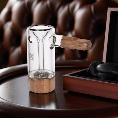 The Steamboat Bubbler, a jewel in MJ Arsenal's prestigious Alpine Collection. Crafted with the finest 100% borosilicate glass, this bubbler epitomizes elegance and durability. Its sleek design is accentuated by the exquisite Milled Black Walnut detailing. Built to last, the Steamboat Bubbler boasts a thick construction that ensures longevity and resilience against the rigors of daily use. Cleaning is a breeze thanks to its clever design, allowing you to maintain its pristine appearance effortlessly. Experience the perfect blend of style and functionality with the Steamboat Bubbler from MJ Arsenal.