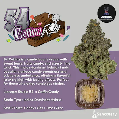 54 Coffinz is a candy lover's dream with sweet berry, fruity candy, and a zesty lime twist. This indica-dominant hybrid stands out with a unique candy sweetness and subtle gas undertones, offering a flavorful, relaxing high with lasting effects. Perfect for those who enjoy candy-gas strains. Lineage: Studio 54 x Coffin Candy Strain Type: Indica-Dominant Hybrid Smell/Taste: Candy | Gas I Lime | Zest
