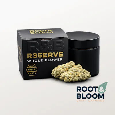 R35ERVE – Wedding Cake (Indica) Triangle Kush x Animal Mints Sweet, doughy aroma with vanilla and earthy notes. Smooth, creamy flavor. Deep body relaxation with a calm, steady headspace. R35ERVE is Root & Bloom's highest-tier flower. Selected for 35%+ combined THCa + terpenes. Limited drops. Peak potency and flavor.