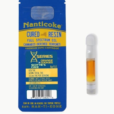 The Nanticoke X Series Orange Cookies x Scotties Cake (often labeled as "Orange Cookies x Scotties Cake" rather than Scotties Cookies) is a 1-gram 510 vape cartridge featuring a sativa-dominant hybrid extract. It combines the zesty, citrus-sweet terpene profile of Orange Cookies with the creamy, dessert-flavored complexity of Scotties Cake, resulting in a balanced and flavorful vape experience.