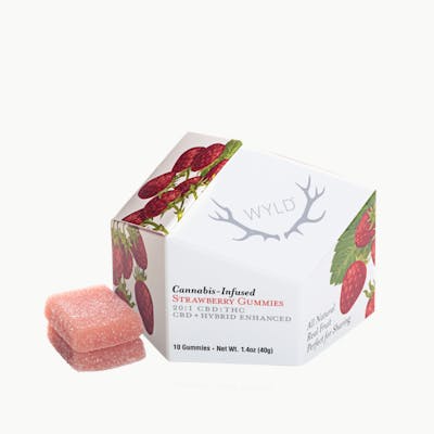 Wyld's Strawberry 20:1 CBD:THC Enhanced Gummies are made with real fruit and enhanced with cannabis-derived CBD oil. Relaxing your body while keeping your mind sharp and alert. It is the go-to gummy if you are looking to decompress or take the edge off, but still have things to check off of your to-do list.