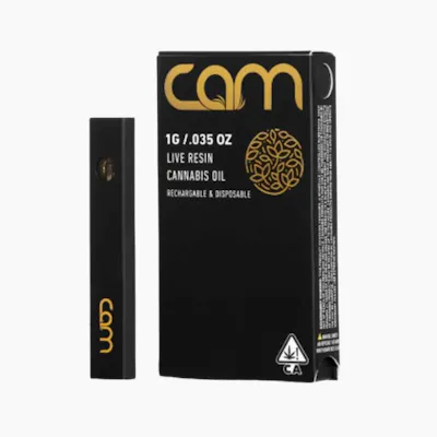 A 1g disposable live resin vape branded under California Artisanal Medicine—ultra-slim and rechargeable, featuring an all-in-one oil-and-battery design for portability and convenience. CAM is a woman-owned, California-based grower established in 2009, specializing in sustainably grown, full-spectrum live resin.