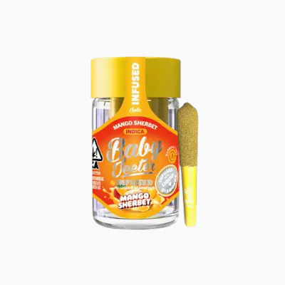 Mango Sherbet - IndicaMango Sherbet is an indica cross between Mango Trees, Mango Kush, and Sherbert. It grows fluffy, resinous buds that produce a fruity aroma of mango and sherbet. Mango Sherbet keeps you motivated, making it an ideal strain for an afternoon adventure or creative escapes.Jeeter’s Quad Infused Prerolls combine four layers working in sync for a maxed out infused experience. THCA diamonds add potency, rosin brings smooth, full spectrum depth, expertly crafted terpene profiles help shape the entourage effect while enhancing aroma, and a kief finish adds strength with a hand crafted touch. The result is a harder hitting experience with richer flavor that lasts longer.* Infused w/ THCA diamonds and rosin, dusted in kief* 5 x 0.5G Quad-Infused Minis totaling 2.5 Grams Per Pack