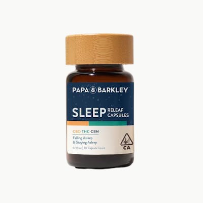 Papa & Barkley’s Sleep Releaf Capsules (30-pack) are vegan, full-spectrum ingestibles designed to support restful sleep through a balanced 1:1:1 ratio of CBD, THC, and CBN.