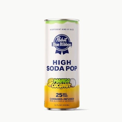 Pabst Blue Ribbon High Soda Pop just got a whole lot tastier. Introducing PBR Mango Coconut. Each can is infused with 25 mg of THC and made with fruit juice concentrates for bold, refreshing flavor. These non-alcoholic cannabis sodas are extra sessionable and deliver a smooth, consistent buzz. Available now at your local dispensary.