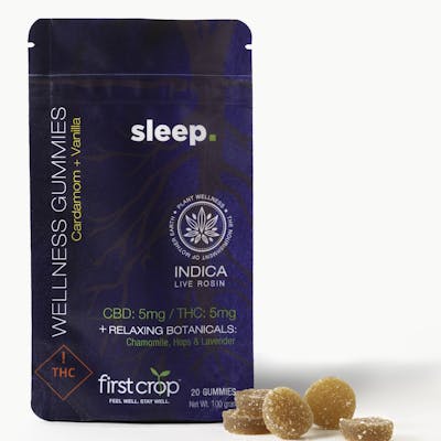 A 1-to-1 gummy featuring 5mg of THC and CBD and crafted with the purpose of helping you sleep. Flavored with a blend of caradamom and vanilla. Sleep also features chamomile hops and lavender. Vegan rosin-based gummies with a user-friendly dosage and recyclable packaging. Crafted with care by First Crop.