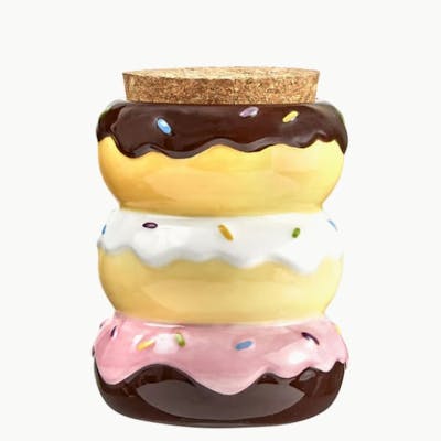 Stash your coffee, teas, spices, herbs and medical herbs in a fun donut style stash jar. This trendy jar has a realistic look, sure to bring a wow factor to your kitchen shelf. The stash jar is made of ceramic in the shape of three stacked donuts. The donuts have a realistic look, smothered in icing and colored sprinkles.