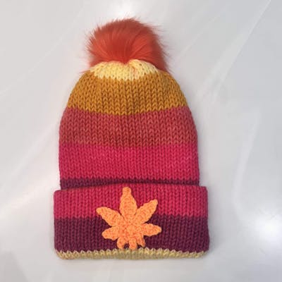 Budtender made double thick fun knitted toque! Fits small to medium. Unstretched inside measurement is 14" and stretches to 20" - 100% acrylic with crocheted pot leaf and matching faux fur pom.