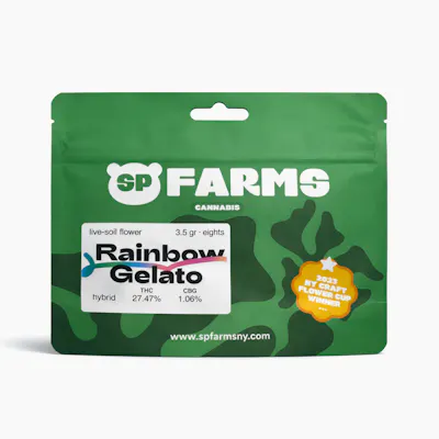 THC % - 27.47% SP Farms Rainbow Gelato is a boutique 3.5g Hybrid flower mylar bag, meticulously engineered for the "flavor-and-feeling" connoisseur who demands elite potency and a decadent, candy-shop profile. This premium cultivar—a vibrant cross of Rainbow Buds x Gelato 41—is celebrated for its remarkable "bag appeal" and its ability to deliver a high-performance, multi-dimensional session. It delivers a mouth-watering and complex aromatic profile of sweet tropical berries, creamy vanilla-lavender, and a sharp, earthy-gas finish. It provides a harmonious and "luminous" high: a quick-hitting surge of cerebral euphoria and "happy" social energy that gracefully anchors into a soothing, full-body ease—making it the gold standard for social weekend outings, creative flow, or a luxurious late-afternoon "mood-lift."