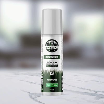 CBD | CBG 1:1 Menthol | Eucalyptus | Camphor 1 fl oz (30ml) Full Spectrum | Under .3% THC The ideal addition to your pre and post-workout recovery regimen. Windy Village RECOVER roll-on topical is packed with 1500mg (mild) of total cannabinoids. The 1:1 ratio of CBD to CBG gives you 750mg of each in a pocket-size form. The stainless steel roll-on ball with leak-proof head allows for an even application without gunking up. All natural ingredients include: Coconut Oil (MCT)* Oleic Sunflower Oil* Jojoba Oil Menthol Camphor Eucalyptus* *Organic