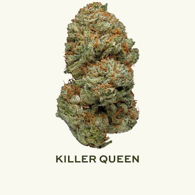 Killer Queen (G13 x Cinderella 99) - This sativa dominant strain was bred in a collaborative effort by Brothers Grimm and Vic High in the 90s. The strain has flavors of citrus, pine, and turpentine and depending on the batch can have elements of a funky almost cheesy terpene from the Cinderella 99. It has strong uplifting and euphoric cerebral effects that make it great for daytime use. Photo Disclaimer The photos shown on our menu are representative images of the strain and may not depict the specific batch available. For photos of the exact batch you are interested in, please contact your sales representative.