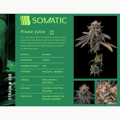 Arrr, this hearty strain be packin’ a punch o’ bold lemon and citrus flavors, with a fiery, herbal twist fit fer a captain! Pirate Juice sends forth a zesty aroma that’ll have yer sails lifted high, boostin’ yer mood and spirit.