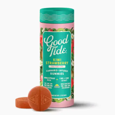 Lean into relaxation and recovery with Good Tide Kiwi Strawberry THC:CBD:CBG gummies. -- Hybrid single-strain rosin along with an extra boost of CBG are wrapped up with juicy kiwi strawberry flavors to help you fully reset. -- 10mg THC:CBD:CBG per gummy, 100mg THC:CBD:CBG per container. -- Made with fully compostable packaging!