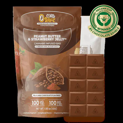The Core Value – Peanut Butter & Jelly Flavored Cannabis Bar™? Made with real peanut butter and inspired by the classic sandwich — only better. Includes 10 sections of 10 mg each (total 100 mg of cannabis per bar). 100mg THC + 100mg CBD per bar 10 breakable sections, 10mg THC each PB&J flavor infused with creamy milk chocolate Made with real peanut butter for authentic taste Affordable, flavorful, and crafted for a timeless high Perfect for: Fans of the classic PB&J sandwich who want to enjoy it in a deliciously elevated, chocolate-infused edible.