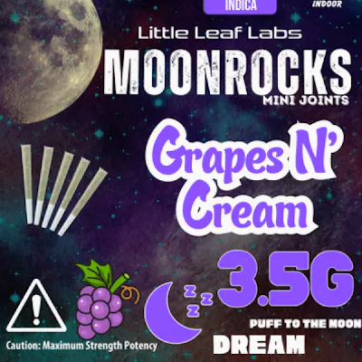 Rich. Creamy. Dreamlike. The Growfather’s 3.5G Indica Grapes N’ Cream Moonrocks Mini Joints deliver sweet grape candy layered with velvety vanilla cream — crafted for deep relaxation and evening wind-down sessions. Each mini joint is built with whole-flower Moonrock infusion for maximum intensity and slow-burn performance.