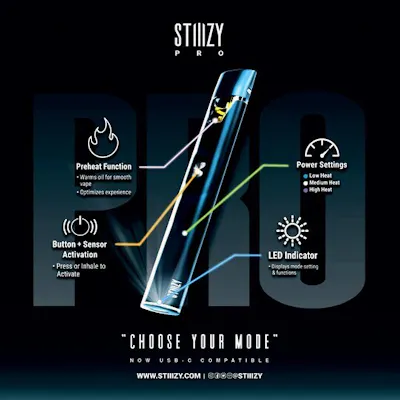 Experience the future of THC delivery with the STIIIZY Pro. This cutting-edge proprietary vape battery features adjustable voltage settings, allowing you to tailor your experience to perfection. Designed with discreetness, portability, and convenience, the STIIIZY Pro is revolutionizing cannabis delivery systems. Elevate your experience with STIIIZY's innovative and inspiring technology. *Not compatible with Portable Power Case. *Remember, pods are sold separately, so don't forget to grab your favorite flavors!