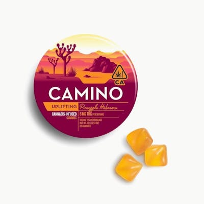 Format: Cannabis-Infused Gummies Weight: 100mg THC total (20 gummies × 5mg THC each) Servings: 20 gummies Type: Sativa-Inspired Effect: Uplifting Flavor Profile: Ripe pineapple · Subtle spice · Sweet heat Main Effects: Energized · Uplifted · Creative Category: Edibles Ingredients: Organic tapioca syrup, sugar, gelatin, malic acid, natural flavors, citric acid, cannabis extract, fruit & vegetable juice for color, natural terpenes, coconut oil, carnauba wax.Camino Uplifting Pineapple Habanero Gummies combine juicy tropical flavor with a gentle kick of heat for a bold, energizing experience. Each gummy contains 5mg THC and uplifting sativa-like terpenes designed to spark creativity and focus. Perfect for daytime adventures, these gummies capture the vibrant spirit of California’s Mojave desert — bright, warm, and full of life.