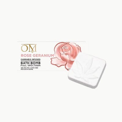 Format: Bath Bomb Potency: 100mg THC / <2mg CBD Spectrum: Full Spectrum Cannabis Essential Oils: Therapeutic Grade Rose Geranium Attributes: Cruelty-FreeExperience: Clear the mind and center yourself with OM’s Rose Geranium Bath Bomb. Crafted with full-spectrum cannabis concentrate, natural fragrances, and therapeutic-grade essential oils, this bath bomb delivers powerful relaxation paired with harmonizing aromatherapy to help melt away everyday stress.