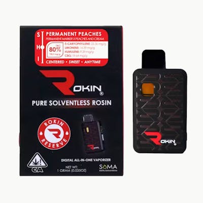 Format: All-In-One Vape Extraction: Solventless Rosin Type: Hybrid Flavor Profile: Peach · Stone Fruit · Citrus · Earthy Spice Main Effects: Balanced · Uplifting · Relaxed Lead Terpenes: β-Caryophyllene · Limonene · Humulene Hardware: Rokin Digital All-In-One Brand: ROKIN ReservePermanent Peaches from Rokin Reserve is a terpene-forward cultivar known for its bright peach aromatics and balanced, earthy sweetness. Juicy stone-fruit flavors lead the experience, layered with warm peppery depth from β-caryophyllene, a crisp citrus lift from limonene, and a clean herbal finish from humulene. The result is a smooth, flavorful vapor experience that blends fruit, citrus, and earthy complexity—great for enjoying any time of day. Rokin Reserve’s solventless rosin extraction preserves the plant’s natural terpene expression for clean, terpene-rich purity. Each device is delivered in a premium Rokin Digital All-In-One featuring preheat, auto-draw or button activation, battery life indicator, and adjustable voltage for a smooth, consistent pull every time.