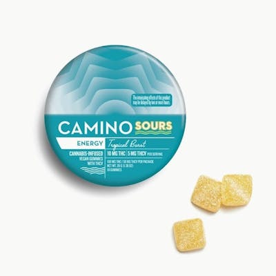 Have you ever dealt with a demanding schedule, approaching deadlines, and a sense of fatigue creeping in? This is precisely when Camino Sours Tropical Burst Energy gummies step in to give you just the boost you need. Packed with 10MG of THC and 5MG of THCV with sativa-like terpenes and the vitamins B6 and B12 combined with the perfect amount of caffeine (10mg), these gummies are your ticket to an enlivened experience. THCV is your energy-boosting ally, potentially enhancing metabolism and curbing appetite. It ensures a clear-headed journey ahead. Vitamin B6 is a prominent player in the body's energy-production process to give your body the fuel it needs for physical activity. Vitamin B12 helps keep your body's blood and nerve cells happy. Caffeine (10mg per serving), the world's most popular stimulant, is renowned for its mood-enhancing properties. We add just enough to support increased alertness and a reduction in fatigue, providing a pep in your step equivalent to half a cup of iced tea. Whether you're about to embark on a thrilling adventure, or simply need a boost to seize the day, Tropical Burst Energy Camino Sours are your go-to choice for an invigorating experience that propels you forward with newfound vitality. Terpenes: Alpha-Pinene, Beta-caryophyllene, Limonene, Valencene