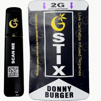 What's cookin'? The 2-Gram Donny Burger Special! 🍔🤫 Dive into the mysterious and delicious world of Donny Burger with G-Stix's potent, TWO GRAM vape cartridge. Known for its unique blend of gassy funk and surprisingly savory notes, this strain offers an experience that's both intriguing and deeply satisfying. Inhale the complex aroma – a fusion of sharp gassy diesel, earthy undertones, and a hint of something... meaty? Cheesy? It's the Donny Burger enigma! Exhale smooth, powerful vapor that delivers a wave of relaxation and a happy, contented buzz. If you're looking for a vape that's off the beaten path and packs a serious punch, the 2-Gram Donny Burger Special is your order. It's a flavor adventure with a seriously satisfying high. Get ready to explore the unique and potent world of Donny Burger! 🍔⛽️❓