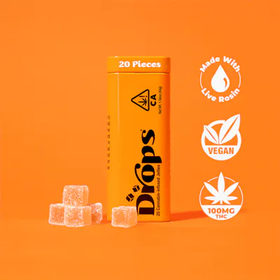 Made with Strain-Specific Live Rosin Strain: Orange Sherbert (sativa) Effect: Creative. Mentally Stimulating. Dosage: 100mg THC Pieces: 20