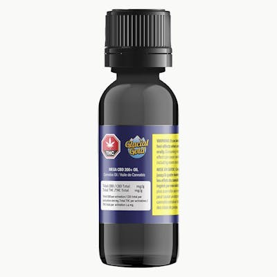 Glacial Gold Mega CBD 200+ Oil features certified organic MCT oil from coconuts infused with broad spectrum CBD extracts. This potent CBD formula provides a total of 8000 mg CBD per 40ml bottle. Glacial Gold high-purity extracts are processed through a patented closed-loop chilled alcohol extraction process including multi-stage refinement, purification, and distillation. Each bottle includes a Click-dose syringe for easy dosing, with 200mg of CBD per 1.0ml syringe activation.