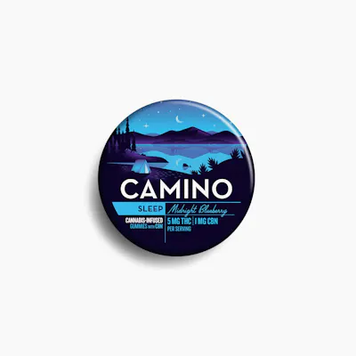 CBG: 2.6mg | CBN: 19.6mg | THC9: 92.2mg | Flower Equivalent: 0.37g -- Lineage: Indica Blend Our top-selling product - and for a reason. When the day's demands set you up for a restless night, there's a perfect companion waiting for you: Midnight Blueberry Camino ‘Sleep’ Gummies, specially crafted to lull you into a deep and tranquil sleep that will leave you feeling truly refreshed. With a carefully crafted blend of 5MG THC and 1MG CBN with indica-like terpenes plus chamomile and lavender extracts, these delicious gummies settle you down into a smooth slumber as if you’re underneath the stars. THC acts on CB1 receptors in the nervous system and has been associated with greater ease of falling asleep- as well as pain management, which contributes to better sleep. CBN (aka Cannabinol) is shown in preliminary studies to have tranquil properties, particularly when paired with THC. Chamomile is widely regarded as a sleep-inducer, creating a mild effect that helps decrease anxiety. Lavender interacts with the neurotransmitter GABA to help soothe the brain and nervous system and reduce restlessness When all these synergistic components come together, the result is a restful night followed by a refreshed morning. Sweet dreams! -- Expiration Date: 2027-03-09