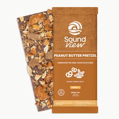 THC9: 92.2mg | Flower Equivalent: 0.37g -- Lineage: Indica Blend Experience elevated snacking with our infused Peanut Butter Pretzel Milk Chocolate Bar. Bite into creamy milk chocolate, smooth peanut butter, and crunchy pretzel pieces for a delightfully sweet yet salty treat. Infused with Indica strains, this bar helps you snack, relax, and savor the SoundView. Warning: Contains Milk, Soy, Wheat, Peanuts. -- Expiration Date: 2026-06-25