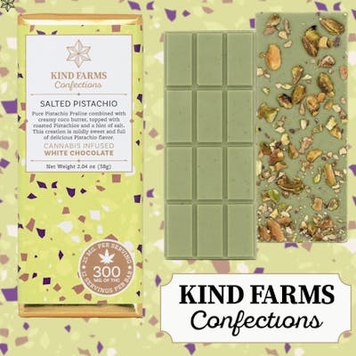 Kind Farms pure pistachio praline combined with creamy cocoa butter, topped with roasted pistachios and a hint of salt. Made with Distillate and Full Spectrum Live Hash Rosin.