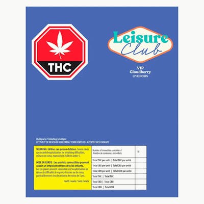 This multipack contains 10 immediate containers, each with one soft chew-for a total of 10 soft chews. Leisure Club VIP (Very Intense Potency) Live Rosin Indica-Dominant Gummy (10mg THC, 10mg CBN, 10mg CBD) Elevate your evening with Leisure Club VIP (Very Intense Potency) Live Rosin Indica-Dominant Gummy. Packed with 10mg of THC, 10mg of CBN, and 10mg of CBD, this powerful gummy is the perfect choice for those seeking a deeply relaxing experience. Crafted with premium live rosin, this balanced blend of cannabinoids is designed to help you unwind, relax, and prepare for a restful night's sleep. The VIP formula brings intense potency to your routine, calming your mind and body as you ease into tranquility. Whether you're winding down solo or looking for that perfect nighttime companion, Leisure Club VIP delivers a potent, soothing experience that lets you drift off effortlessly. Key Features: 10mg THC, 10mg CBN, and 10mg CBD per gummy for a powerful experience Indica-Dominant Live Rosin Blend for optimal relaxation Designed to help you unwind and prepare for restful sleep Very Intense Potency (VIP) for those seeking a deep, relaxing effect Perfect for evening use to help ease stress and promote calm Indulge in the Leisure Club VIP experience-where intense potency meets soothing tranquility for a perfect end to your day. End your day on a peaceful note with Leisure Club's Live Rosin Indica-Dominant Gummy. Infused with 10mg of THC, 10mg of CBN, and 10mg of CBD, this balanced gummy is crafted to support relaxation and help you ease into a restful night's sleep. The calming effects from the blend of cannabinoids are perfect for winding down, letting go of the day's stress, and preparing your body and mind for a deep, peaceful slumber. Whether you're looking to relax after a long day or simply unwind before bed, this gummy helps you find your calm and drift off effortlessly. Produced in: Alberta, Canada Ingredients: Isomalto-oligosaccharide, Sugar, Water, Pectin, Natural flavours, Sodium Hydrogen Malate, Citric Acid, Cannabis Extract, Coconut Oil, Malic Acid, Black Carrot Juice (colour), Sunflower Lecithin, Vegetable Oil, Canola Oil