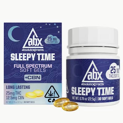 ABX Sleepy Time is a full-spectrum line formulated to support restful sleep. Each soft gel contains 25mg THC and 12.5mg CBN, with long-lasting effects designed to help you relax, unwind, and stay asleep through the night. Made with ice water hash rosin from whole flower, calming terpenes, and no added flavor, Sleepy Time Soft Gels are precisely dosed for reliable, gentle nighttime support. 25mg THC + 12.5mg CBN per soft gel - Indica +CBN · Sleep Support · Relaxation Flavor Free · Ice Water Hash Rosin Long Lasting · Precisely Dosed Ingredients: MCT Oil (Coconut), Gelatin, Glycerin, Ice Water Cannabis Extract, CBN, Terpenes Package Size: 30 capsules Total Cannabinoids per Package: 1,125mg Total THC: 750mg Total CBN: 375mg Total Cannabinoids per Soft Gel: 37.5mg THC per Soft Gel: 25mg CBN per Soft Gel: 12.5mg Intended for oral consumption. Onset time and tolerance vary per individual. Onset Time: 30 minutes – 2 hours Duration of Effects: 2 – 10 hours