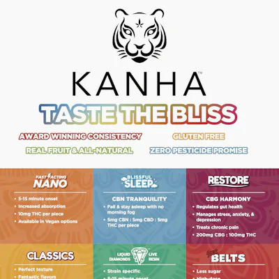 KANHA Hybrid Watermelon Gummies 10mg per serving (10 pcs) KANHA Watermelon gummies are refreshingly juicy and provide hybrid effects, which will put you somewhere in the middle of uplifted and relaxed. Widely considered the best-tasting in the industry, KANHA gummies are made with real fruit, all natural ingredients and contain no major allergens. Instructions: Eat 1 gummy. Wait 90 minutes for full effect. Keep in a cool, dry place. Avoid temperatures over 75°F. Ingredients: Tapioca Syrup, Cane Sugar, Water, Gelatin, Agar, Locust Bean Gum, Carnauba Wax, Natural Flavor, Citric Acid, Cannabis Oil, and Natural Color.