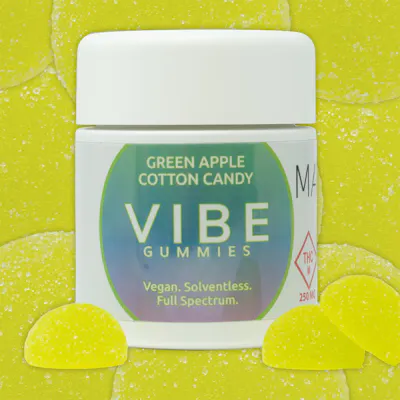 Green Apple Cotton Candy flavor notes: Sweet green apple. 100mg Solventless Vegan Gummies The cleanest, most natural gummies have arrived in Missouri. VIBE’s live rosin gummies are infused with its full spectrum, solventless, award winning live hash rosin. All flavors are naturally derived from plants and infused into our vegan candy recipe. Unlike distillate gummies, which generally use ethanol or butane solvents to extract only THC of dry trim, our live rosin gummies use only fresh, full bud plants to extract all cannabinoids using only water and heat. This creates a clean, full spectrum, terp-rich experience with smooth effects; there is nothing better. New Recipe. More Flavors. Same VIBE.