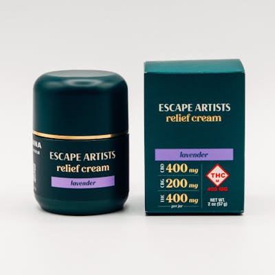 Escape Artists 2:1:2 (400MG CBD, 200MG CBG, 400MG THC) Lavender Relief Cream NOW ENRICHED WITH CBG for added anti-inflammatory benefits! Whether you’re kickstarting your day or eyeing the finish line, Escape Artists has your back. Our signature Lavender formula provides extra relaxation–whenever, wherever. Just kick back and enjoy the aromatherapy while the cannabinoids go to work unknotting all the aches your meditation app can’t touch. With this upgraded formulation, we've taken our best-selling potency of 400mg each of CBD and THC, combined it with the added support of 200mg CBG. Our award-winning formulas combine cannabinoids with essential oils and botanical ingredients to deliver high-performance results. Our creams are trusted by thousands of customers, providing consistent results and targeted support, without compromise. [How to Use] Massage liberally into skin over the affected area. Reapply every 2-3 hours as needed. [Ingredients] Water, isopropyl palmitate, caprylic/capric triglyceride, propylene glycol, ceteareth-20, cetearyl alcohol, glyceryl stearate, PEG-100 stearate, dimethicone, octyldodecanol, lecithin, ethylhexylglycerin, phenoxyethanol, cannabidiol, cannabis extract, artificial color (FD&C Red 33, FD&C Blue 1), and lavender oil. [Specifics] 400mg CBD / 200 MG CBG / 400mg THC (2:1:2 ratio) per 2.0oz jar