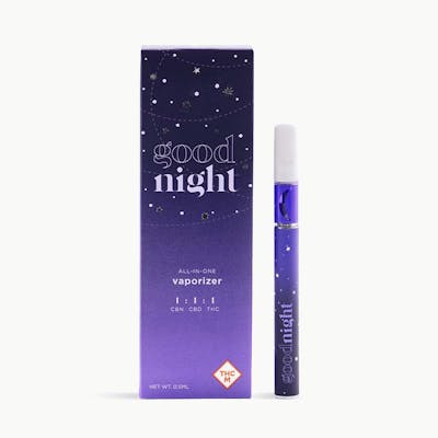 .5g All-in-one vaporizer 1:1:1 CBN / CBD / THC Goodnight all-in-one vaporizer contains CBN, CBD and THC. This perfect blend works in tandem to bring on a relaxing, sedative effect—helping you to achieve a restful sleep.