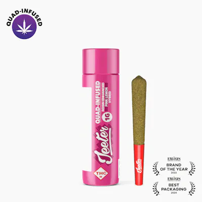 A balanced hybrid bursting with sweet raspberry and citrus candy notes. This one’s a creeper—starting with an uplifting head high and a gentle energy boost before settling into pure relaxation. Stay functional, stay elevated. Effects: The high is very relaxing but not sleepy. It's a bit of a creeper starting with a very nice clean head high with an energy boost. It puts you in a positive mood with positive thoughts. An evenly balanced hybrid that still allows you to function. Flavors: The aroma is sweet raspberry and lemon. On the dry hit you taste sweet raspberry with a little bit of candy citrus. The flavor is fruity, sweet raspberry with candy citrus notes and some grapefruit on exhale. Jeeter Quad-Infused Pre-rolls; Premium flower infused with Liquid Diamonds, Live Rosin, Terpenes and coated with Kief.