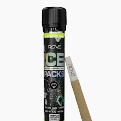 Rove Ice Packs, the world's first triple-infused preroll. Made with premium-grade flower fully infused with THCA diamonds and solventless ice hash rosin, theyre expertly rolled, then coated with more ice hash. Super smooth and ultra potent, Rove Ice Packs test up to 50% THC. Welcome to the next evolution of prerolls. A zesty sativa-forward strain bursting with sharp citrus and herbal spice, Sour Lime Haze delivers the perfect energizing lift with just enough smooth relaxation to keep you balanced and motivated.