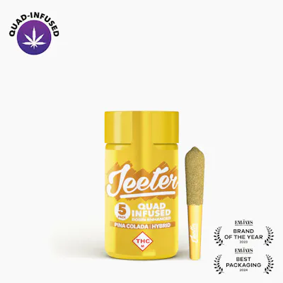 Jeeter Quad-Infused Pre-rolls; Premium flower infused Pina Colada is a hybrid strain with sweet, tropical flavors like pineapple and coconut on both the inhale and exhale. Smooth and balanced, it's an easy choice for any time of day. It’s five o'clock somewhere, so light up and relax with a Pina Colada in hand.