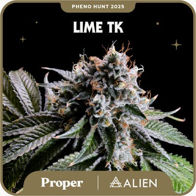 Lineage: Triangle Kush x Lime F4 Breeder: Alien Genetics An intense burst of sour lime juice and sharp chemical lime cleaner shocks the senses with electrifying clarity. Waves of zesty lime rind and nose-burning lime gas cascade through the palate, delivering an unforgettable flavor experience. Proper x Alien Genetics | Pheno Hunt 2025 Proper and Alien Genetics are on a mission to uncover the most unique and unforgetable strains in the galaxy—pairing legendary genetics with Proper's cultivation expertise.
