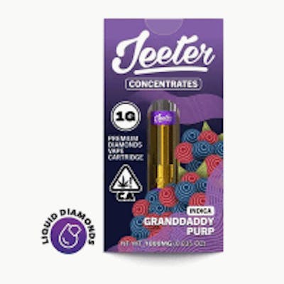 Granddaddy Purp Jeeter Concentrates Diamonds Vape Cartridge: 1000 mg | Indica | 92.045% THC (Per Cartridge) At the core of Jeeter is our Culture .. a culture of love, passion and innovation. We value relationships and the culture of our company can been seen in everything we do from our products, to our brands, to our facilities, to our love for our customers and each other.