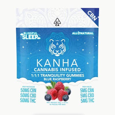 KANHA Blissful Sleep 1:1:1 Tranquility Gummies 5mg CBN, 5mg CBD, 5mg THC per serving (10 pcs) High Times Cup award-winning KANHA 1:1:1 Tranquility gummies are specially formulated with blissful sleep in mind. These best-selling gummies feature sleep-inducing CBN and a blend of soothing terpenes to help fall asleep, stay asleep, and wake up with no morning fog. Widely considered the best-tasting in the industry, KANHA gummies are made with real fruit, all natural ingredients and contain no major allergens. Instructions: Eat 1 gummy. Wait 90 minutes for full effect. Keep in a cool, dry place. Avoid temperatures over 75°F. Ingredients: Tapioca Syrup, Cane Sugar, Water, Gelatin, Agar, Locust Bean Gum, Carnauba Wax, Natural Color, Citric Acid, Cannabis Oil, Natural Flavor, and Natural Terpenes.